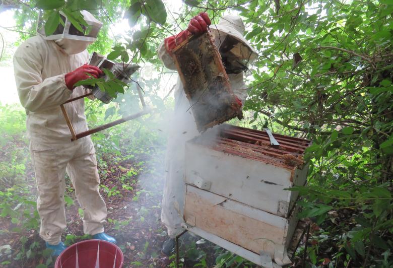 Dans la sous-préfecture de Kolenté, les forêts verdoyantes s’étendent sur de vastes surfaces. Ce cadre naturel offre des conditions idéales pour le développement de l’apiculture, une activité déjà pratiquée par plusieurs groupements, mais avec des moyens et des connaissances rudimentaires. Leur objectif est avant tout de trouver du miel, soit en pillant des nids sauvages, soit en le récoltant dans des ruches en paille. Comme le raconte une apicultrice du village de Kinsanya, bénéficiaire d’un précédent soutien : « Auparavant, je m’occupais seule de trouver du miel de manière désordonnée. Avec mon mari, nous abattions les arbres et détruisions les colonies d’abeilles sans même en avoir conscience. Aujourd’hui, je pratique complètement différemment. Nos artisans ont même été formés à la fabrication de ruches. Pour moi, la première récolte a marqué un véritable tournant, qui m’a convaincue de l’efficacité de cette approche. »